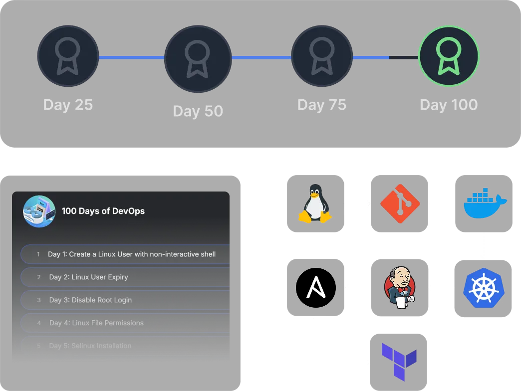 Real Tools, Real Skills — Use Git, Docker, Kubernetes, Linux & more — exactly what real teams use.