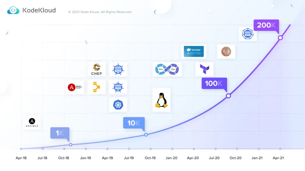 Since then, KodeKloud has grown a lot, and it’s all thanks to you—KodeKloud's amazing community. Your support and love for KodeKloud courses have helped it get to where it is today. KodeKloud created courses that are easy to follow, hands-on, and packed with the knowledge you need to succeed in DevOps, cloud, and technology.