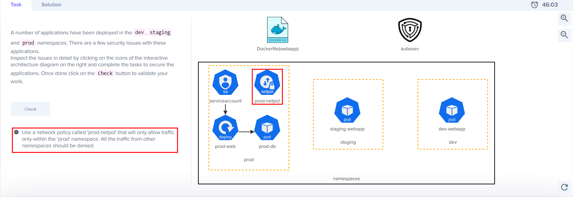 You can click on the “Check” button to validate if a task is complete. If complete, the icons in the architecture diagram will be highlighted in green. If something is incomplete, it will be highlighted in red.