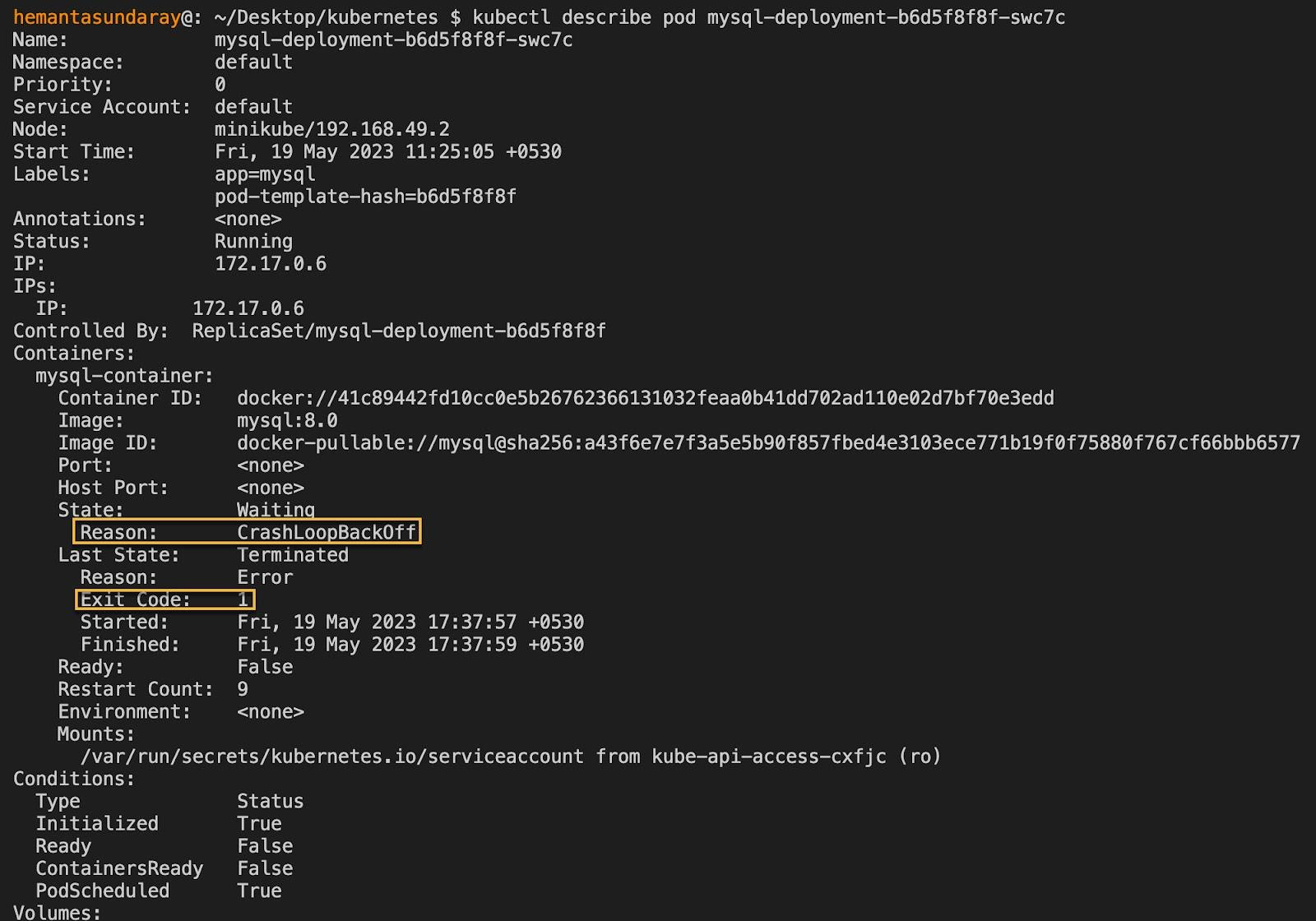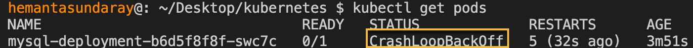 As you can see, the Pod has a CrashLoopBackOff status as highlighted above.