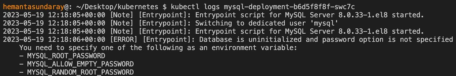 The logs clearly indicate the reason for the error — we have not set the password in our Deployment configuration. To resolve this issue, one of the options is to define the MYSQL_ROOT_PASSWORD the environmental variables section of our Deployment configuration. Let’s do that now.