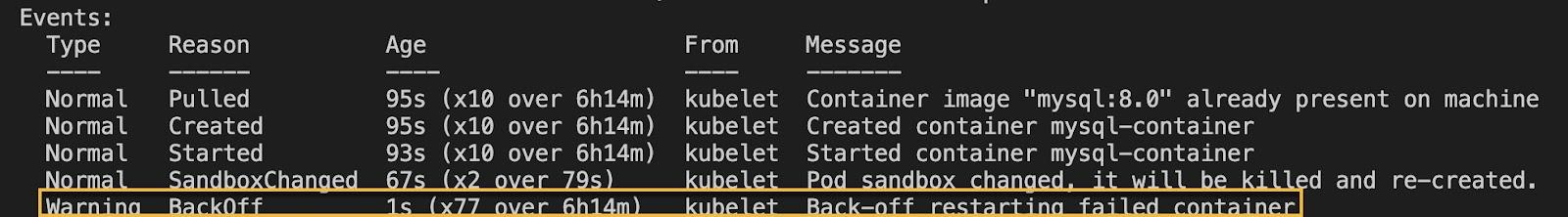 In the last line of the Events section, we find the statement Back-off restarting failed container. This means that the kubelet attempted to restart the container after a failure but was unsuccessful. As a result, the kubelet will make another attempt to restart the container. Now, you might wonder, what does "Back-off" mean?