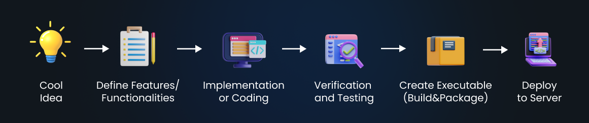 First, think of a good idea for an application that solves a problem or improves a workflow. Then, gather and define the features it should have. Developers will then write the code. After coding, testers will check the application to make sure it works.