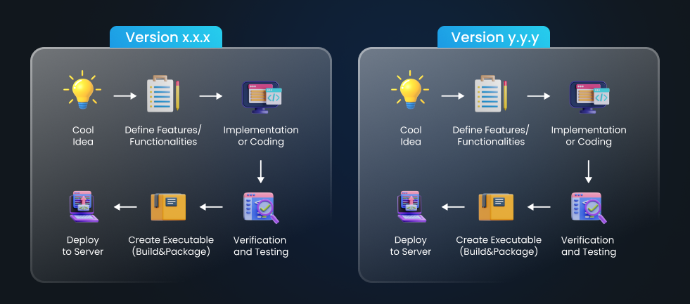 To manage software application updates, you use version numbers like 1.x.x, 2.x.x, 3.x.x, and so on. This helps keep track of changes. Hence, the release cycle goes like this(after the initial launch):
