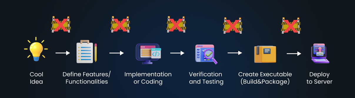 Many other tasks in the release process, such as security checks, and testing, are traditionally done manually. Operations teams often execute commands directly on servers, install tools, configure settings, patch, or run batch scripts manually. This manual work is slow and prone to errors.
