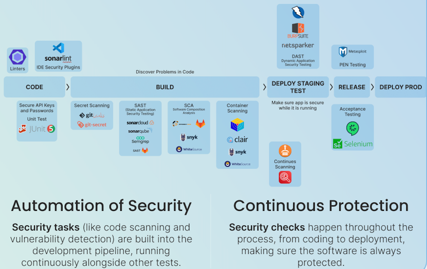 - Continuous scanning tools monitor the application during the testing phase to catch new security issues early.