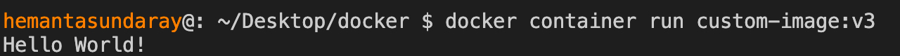 docker container run custom-image:v3You will observe that Hello World! is printed on the console, as shown below: