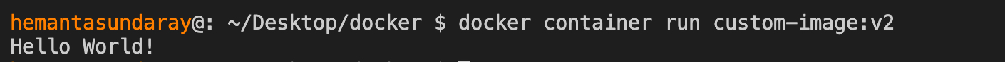 docker container run custom-image:v2You will see that Hello World! is printed on the console, as shown below: