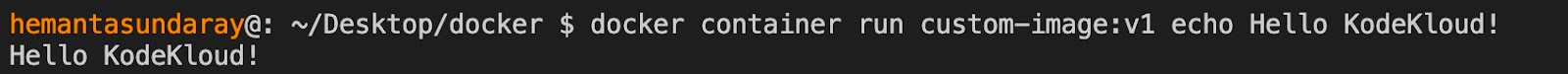 docker container run custom-image:v1 echo Hello KodeKloud!After running this command, you’ll see Hello kodeKloud! printed on the terminal, as shown below: