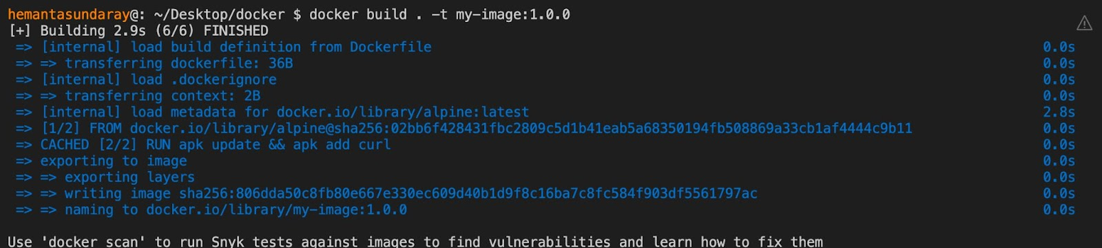 ENTRYPOINT ["curl", "--version"]Now, run the following command to create an image tagged my-app:1.0.0: