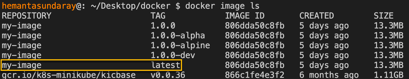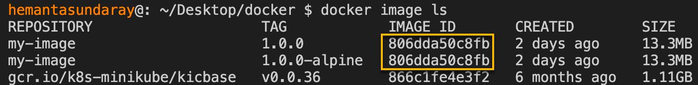 As you can see, the image with the ID 806dd150c8fb is now associated with two different tags: my-image:1.0.0 and my-image:1.0.0-alpine. Both tags are just pointers to the same Docker image (with ID "806dd150c8fb").