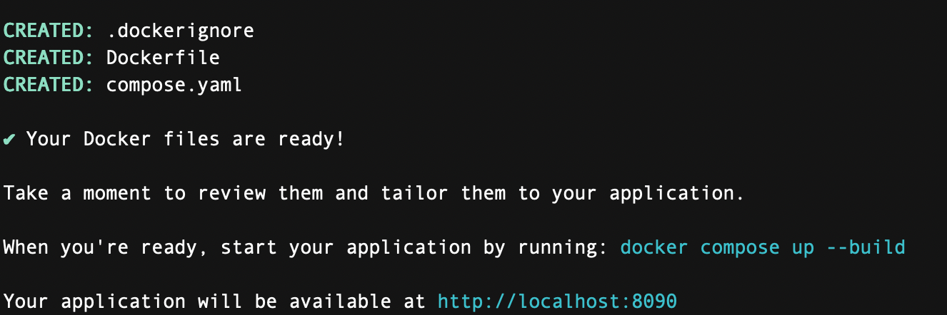 Docker will analyze the project and generate the necessary files. You should see output similar to the following: