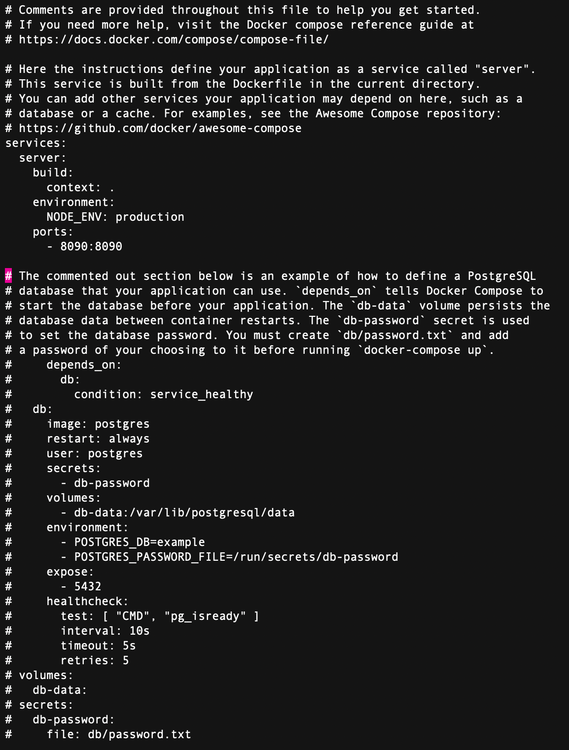 Docker has produced a Dockerfile and a .dockerignore for us. If your project was more complex, Docker might also create a docker-compose.yaml (more on that later), but for a simple single-service app it typically doesn’t unless you request it.