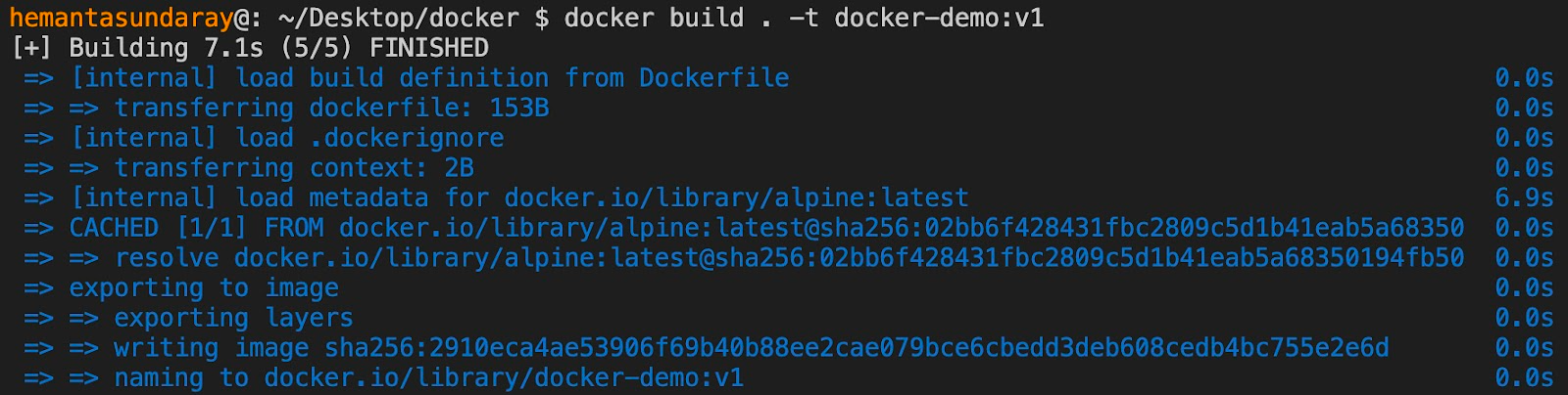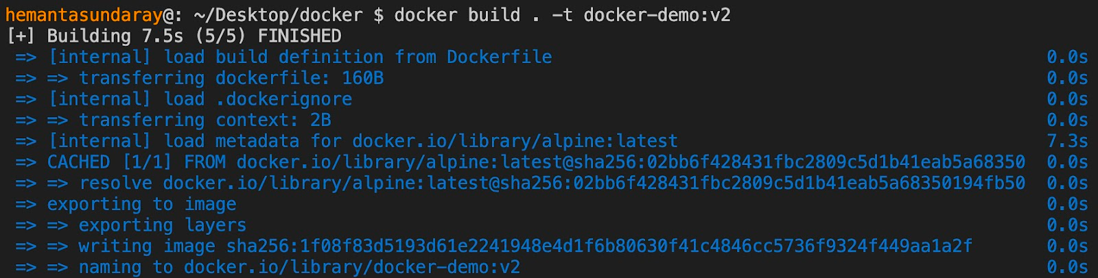 docker build . -t docker-demo:v2After executing the command, you should see an output like this: