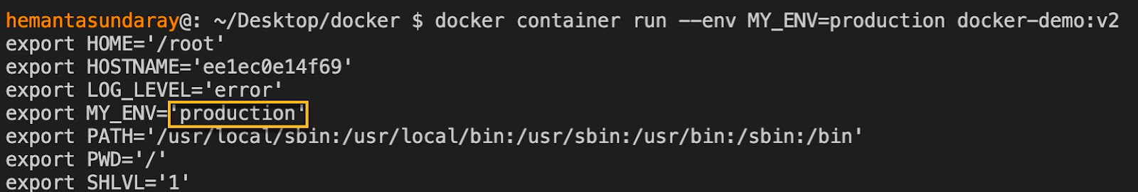 docker container run --env MY_ENV=production docker-demo:v2 Executing the command above will produce an output like this: