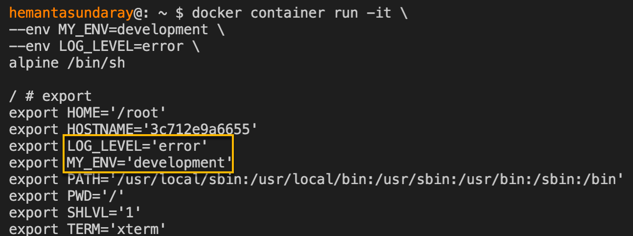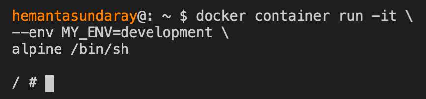 docker container run -it --env MY_ENV=development alpine /bin/shI have used backslash (\) to enhance readability by distributing the command across multiple lines. If you prefer, you can choose to omit the backslashes and run the command in a single line. Here’s the above command in a single line: