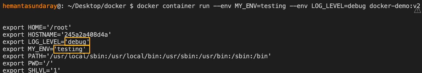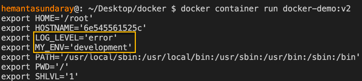 docker container run --env MY_ENV=testing --env LOG_LEVEL=debug docker-demo:v2.Executing the command above will show an output like this: