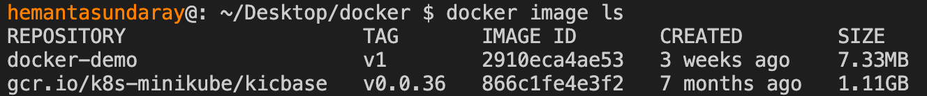 docker image lsYou should see an output with a list of Docker images, including docker-demo:v1, as shown in the output below: