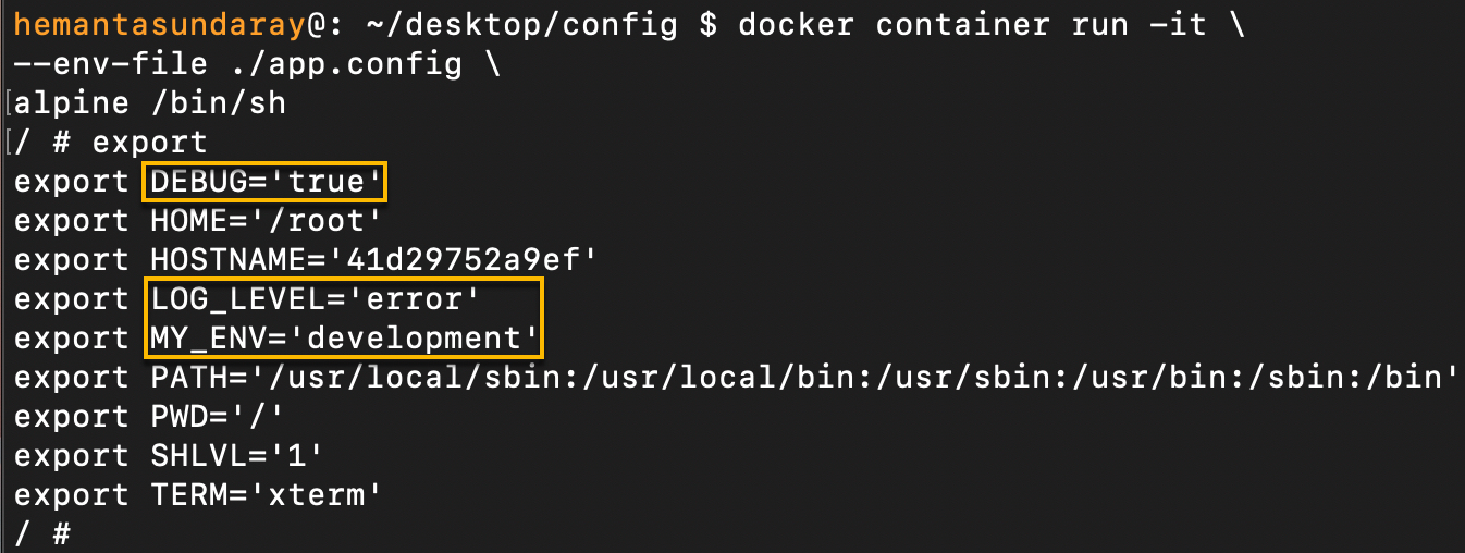 docker container run -it --env-file ./app.config alpine /bin/shNote that you can also run this command in a single line, as shown below: