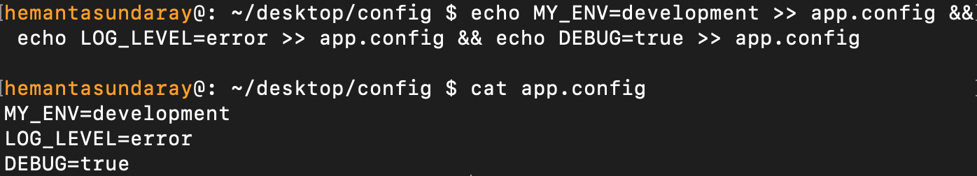 echo MY_ENV=development >> app.config && echo LOG_LEVEL=error >> app.config && echo DEBUG=true >> app.configIn this command, the redirection operator (>>) takes the input from the command to its left and appends it to the app.config file.