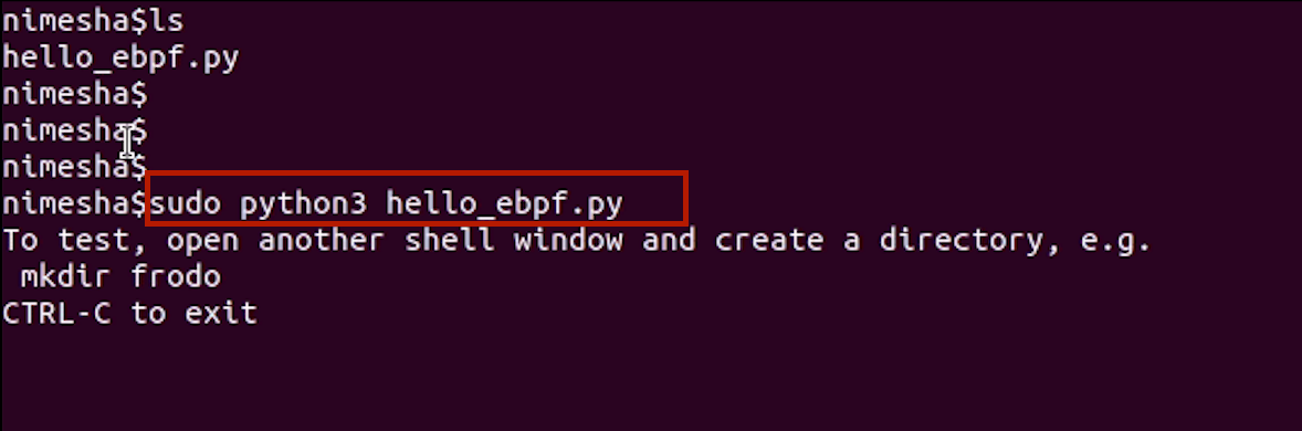 I've got this Python program – let's call it the mysterious "X" python program(hello_ebpf.py). I'm going to run it on my Ubuntu terminal.
