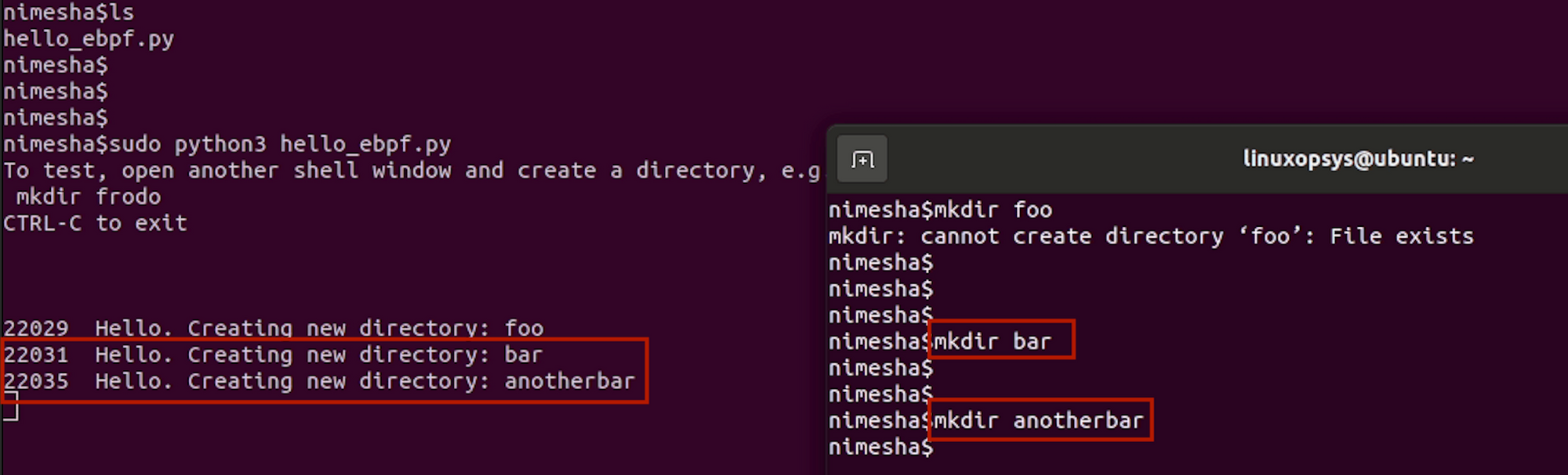 Let's try again. I'll make another couple of folders named "bar" and "anotherbar", And there it goes! Right after creating each folder, the other terminal shows a fancy "hello" message with the folder name.
