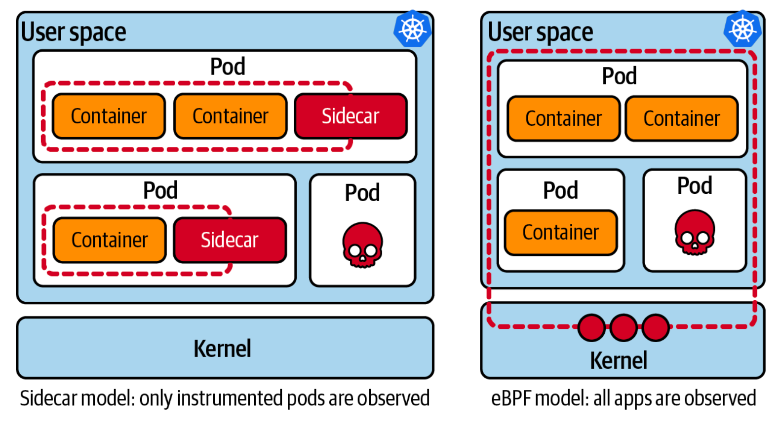 Before eBPF's rise, Kubernetes tooling primarily relied on the sidecar model. This model adds an instrumentation container within the same pod as the application. While it was revolutionary at the time, it has its drawbacks: