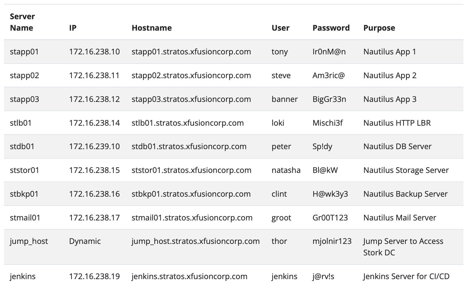 stapp01.stratos.xfusioncorp.com(App Server 01)stapp02.stratos.xfusioncorp.com(App Server 02)stapp03.stratos.xfusioncorp.com(App Server 03)