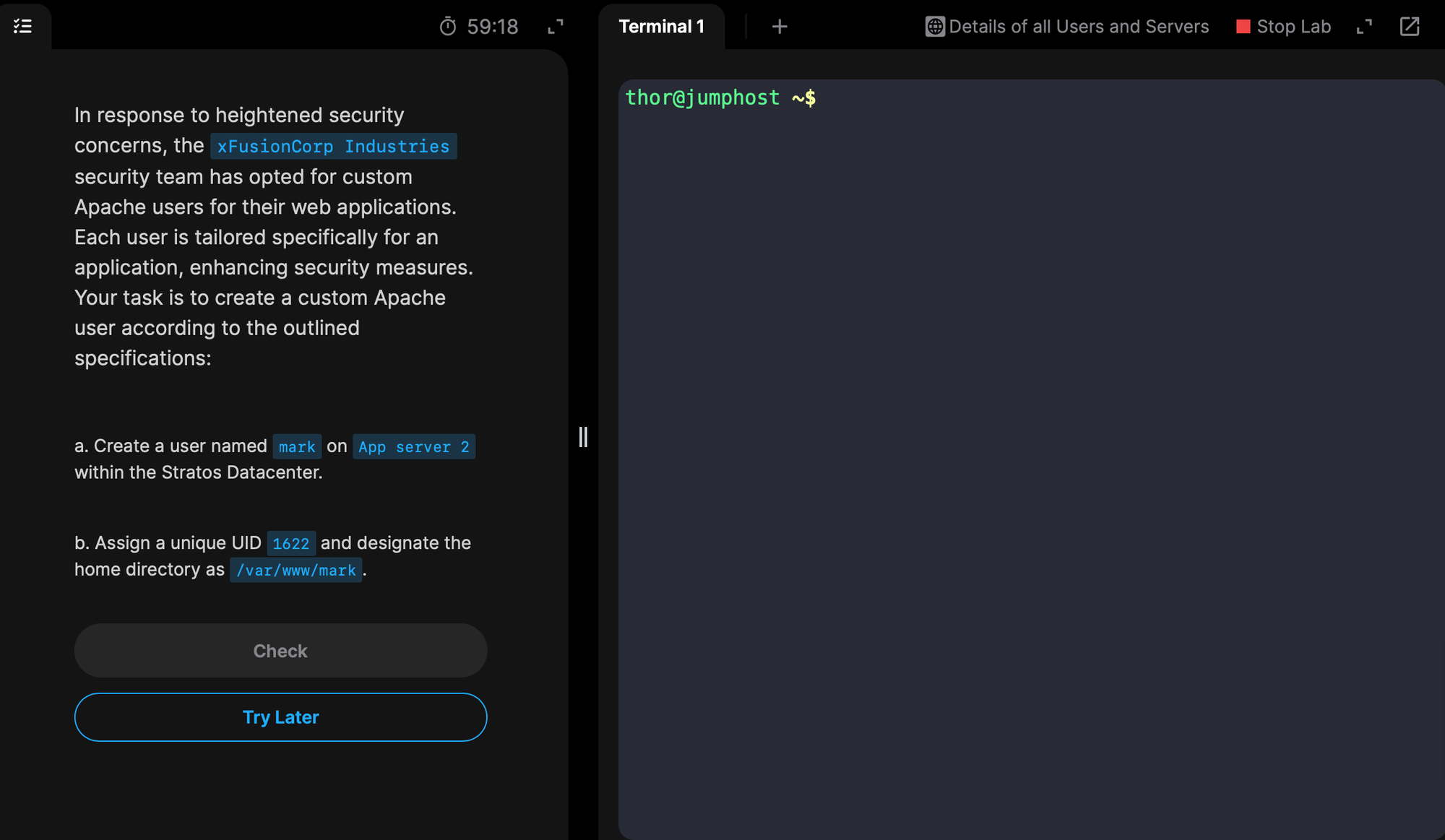 That’s why the lab terminal exists. It places you inside the private Nautilus environment, starting from the jump host. From there, you can safely SSH into the other servers: