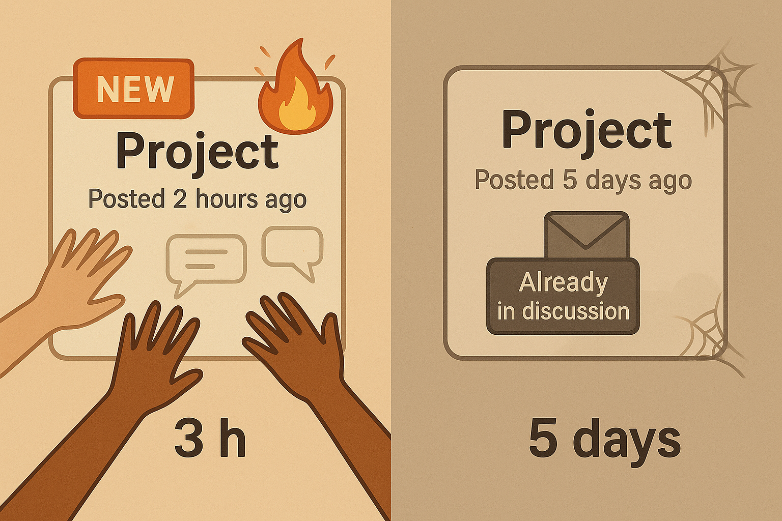 The projects that I got an answer from were almost always recent projects. When I was sending messages to those rarer projects, those were posted 5, 6, 7 days earlier. But these (more-often appearing) projects were posted 6 hours ago, 8 hours ago. And bam! People answered.