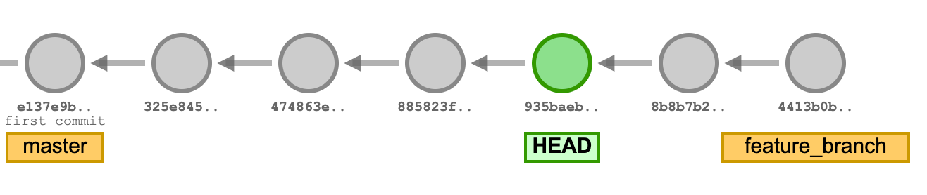 From the image above, we switched or checked out to the commit hash, 935baeb. The HEAD moved from the feature_branch reference to now point directly to the commit with hash 935baeb, which is not on any branch.