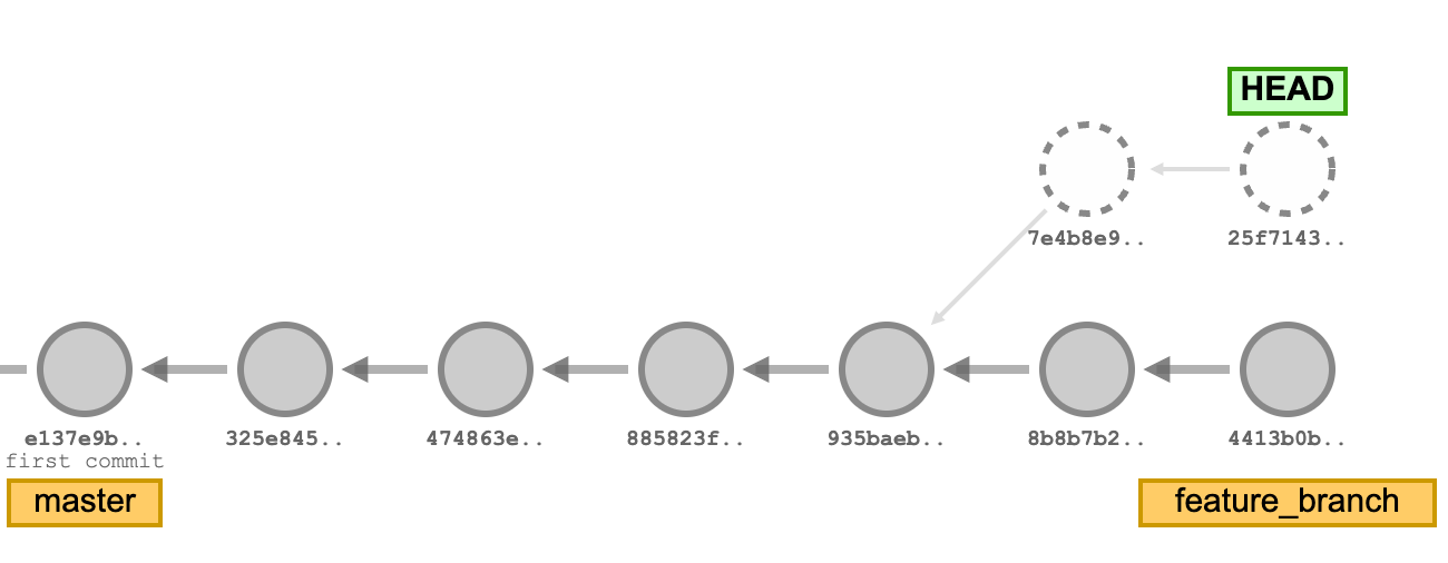 From above, we made extra commits, 7e4b8e9 and 25f7143, in the git detached HEAD state. The HEAD also moved to point to the latest commit made when in this state, as seen above. Please note that all other branches in the example given above, i.e., master and feature_branch, would still exist in your local git repository. The HEAD, which is a pointer, just simply moved to now point directly to a commit.