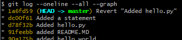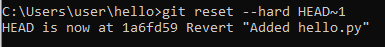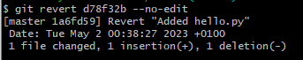 You can see that there is a new commit with the message "Revert 'Added hello.py'" that reverses the changes of the previous commit. You can also use git diff HEAD to see what changes were made by the revert.
