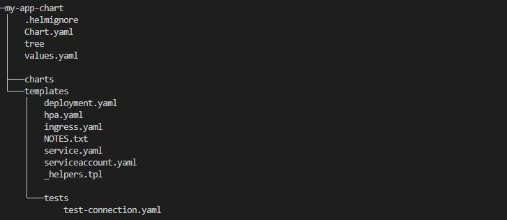 helm create my-app-chartThe helm chart created has the following structure: