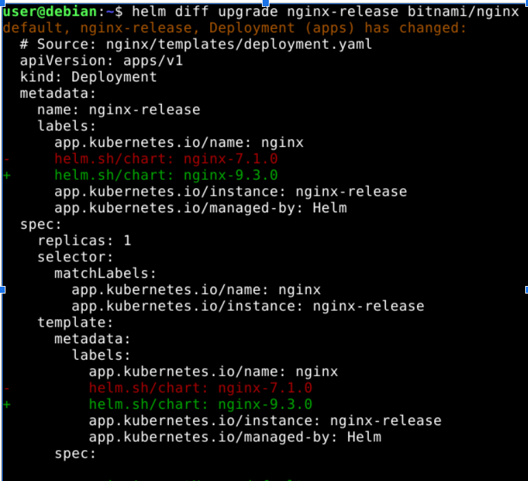 In this case, the minus “-” sign signals that the line would get removed by the upgrade, and the “+” sign shows what the upgrade would add to the new manifest. Although the output is a bit long, it’s very easy to read since changes are highlighted this way. We can see that in our case, most of the changes revolve around upgrading nginx-7.1.0 to a newer nginx-9.3.0. In a real scenario, we would be satisfied that the upgrade indeed does what we need it to do.