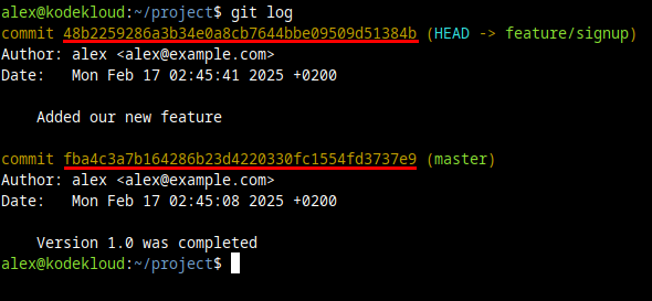 We can see this clearly with the git log command. On the feature/signup branch, if we look at our commits, we'll see this: