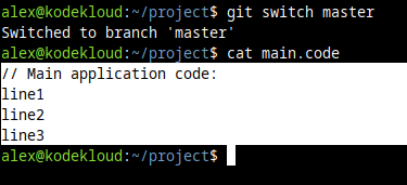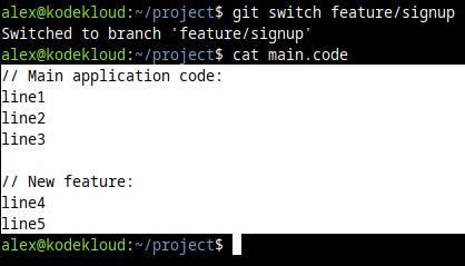 We can already see 4 new lines were inserted. So our main.code file in master should now be up-to-speed with the changes from our feature/signup branch.