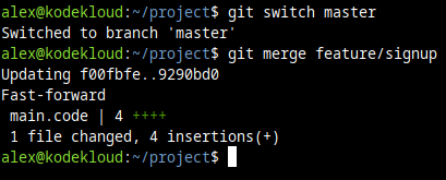 git switch masterAnd then we can merge the changes from our feature/signup branch into our current master branch: