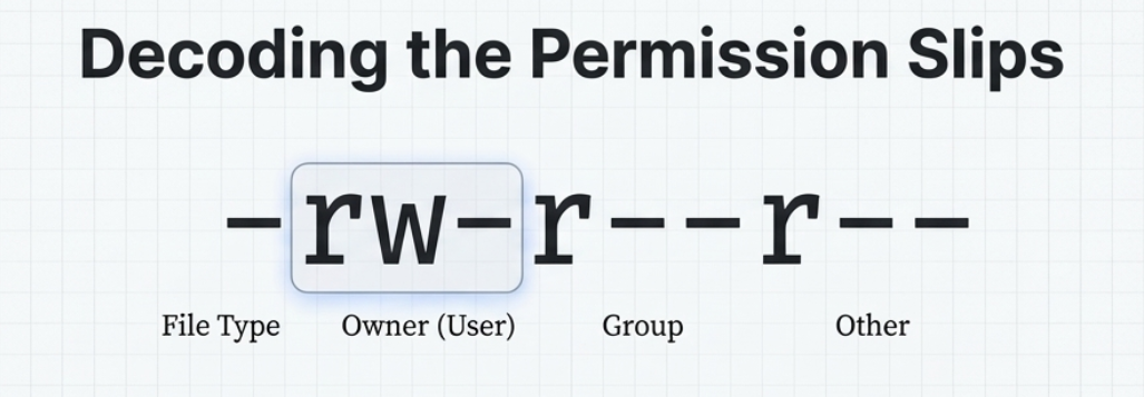 The x permission appears in that spot. Because the first three letters are permissions that apply to the user that owns the file. The next three letters are for the group, and the next three are for the rest of the users on this system.