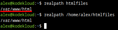 And if we want to inspect just a single symbolic link and see what it points to, we can use the realpath command. For example, to see what htmlfiles points to here: