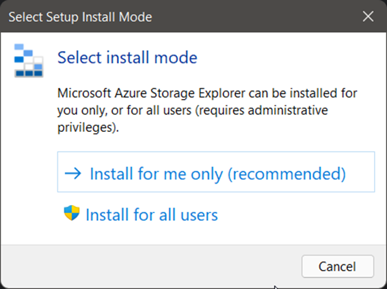 - Install for me only (recommended): Choose this option if you want to install Azure Storage Explorer for your user account only. This is a recommended choice for individual users.