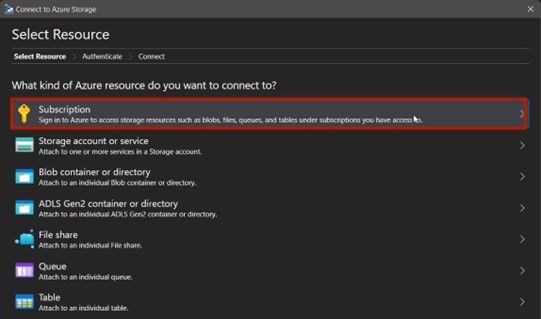 - Select Subscription: In the "Connect to Azure Storage" dialog that appears, select "Subscription" from the "Select Resource" panel. This allows you to connect to the Azure resources associated with your Azure subscription.