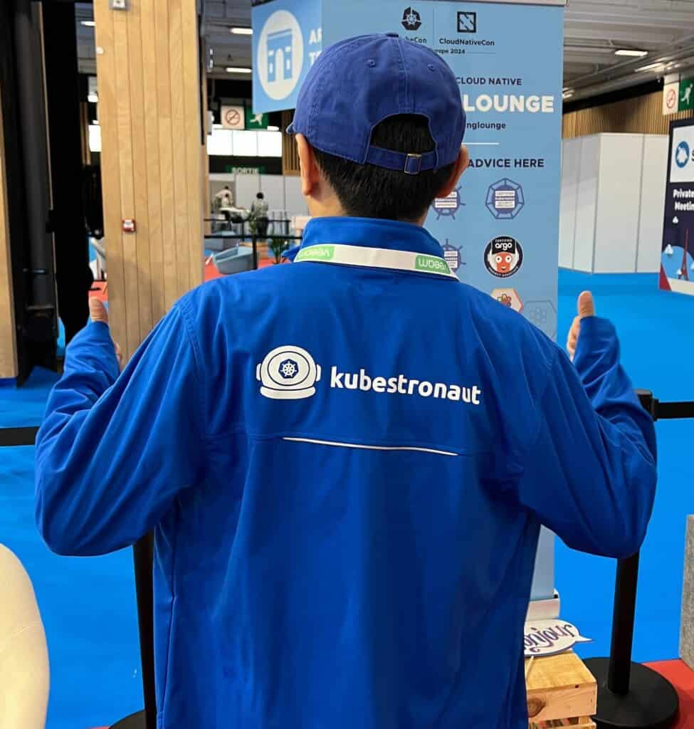 Here is Yonkang He, proudly showcasing the Kubestronaut jacket as the first Kubernetes explorer in orbit!