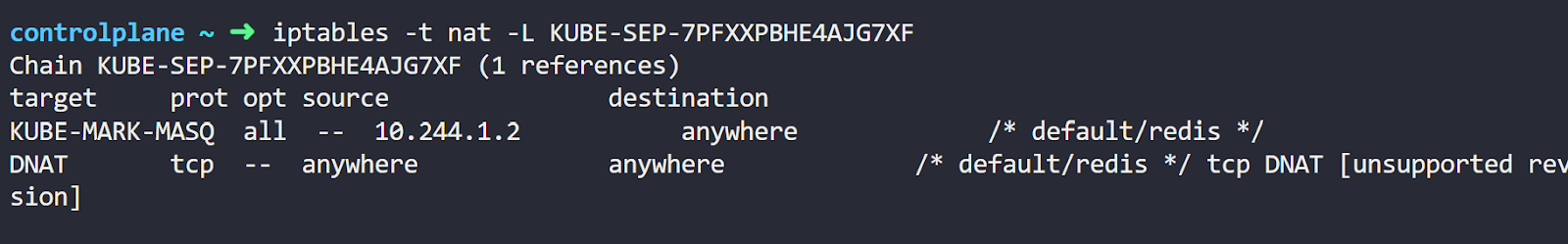 Going into any of these KUBE-SEP chains, we can see it’s basically a DNAT rule.