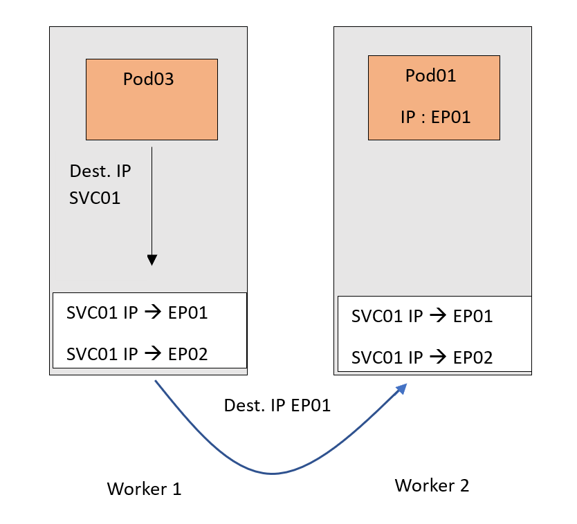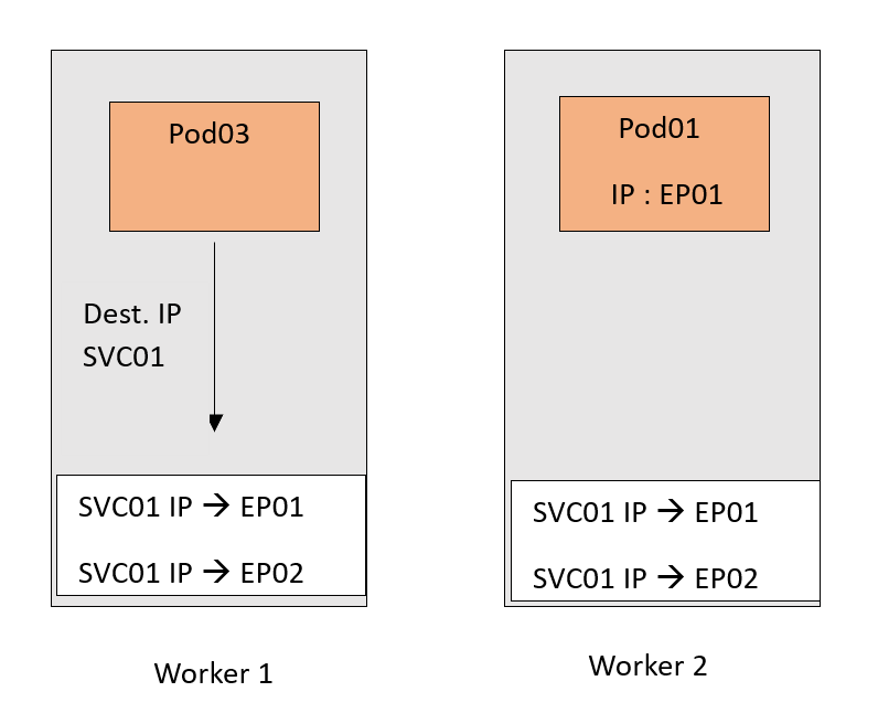 Now traffic destined for the SVC01 IP will follow this DNAT rule and get forwarded to the Pods. Remember that EP01 and EP02 are basically the IPs of the Pods.