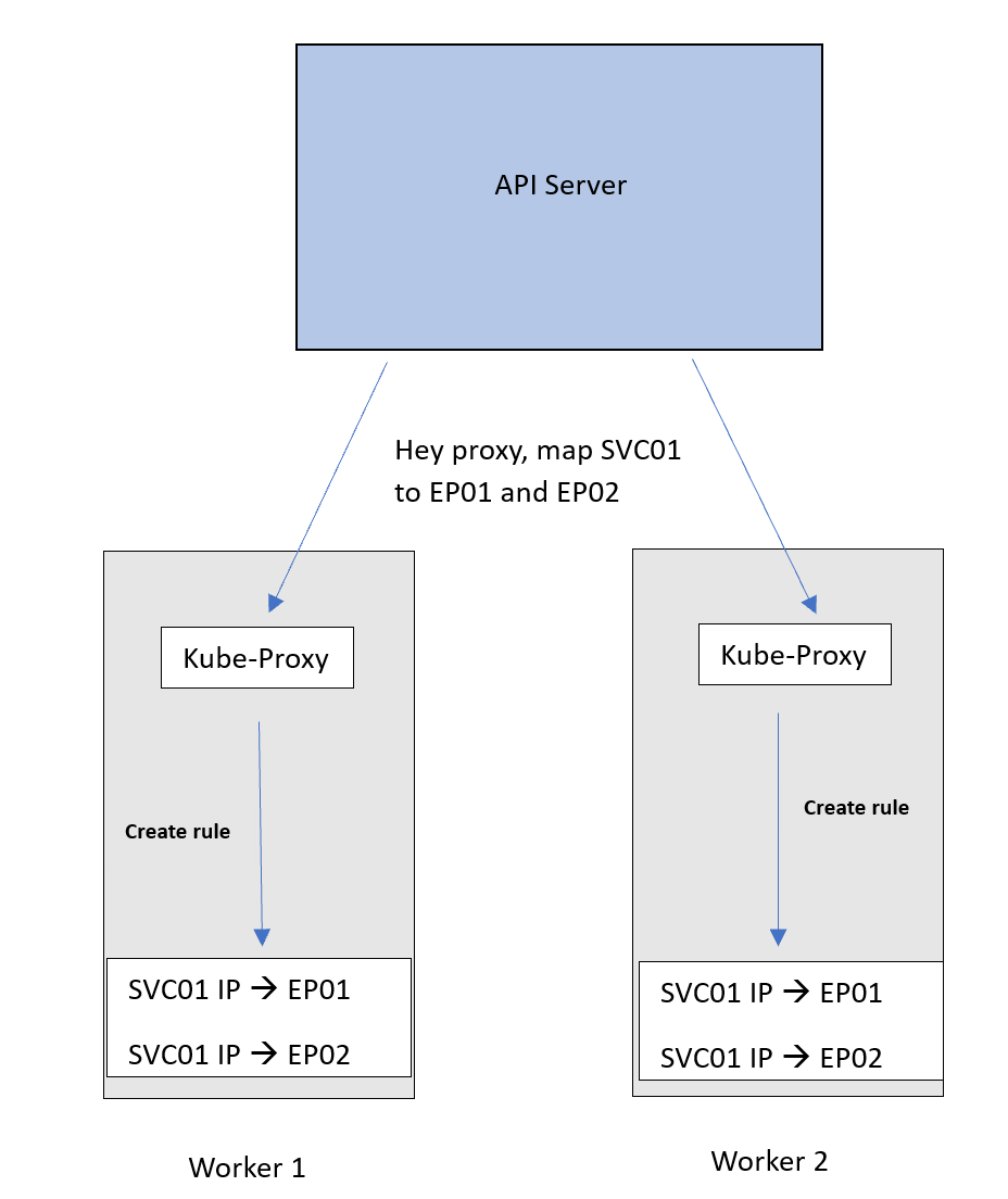 To achieve that, the API server advertises the new mapping to the Kube-proxy on each node, which then applies it as an internal rule.