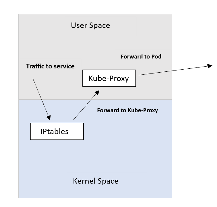 Kube-Proxy in user-space mode makes use of this and inserts a NAT rule inside IPtables. This rule redirects traffic to a local port of the Kube-Proxy itself. Kube-Proxy listens for connections on this port and forwards them to the respective backend Pods.