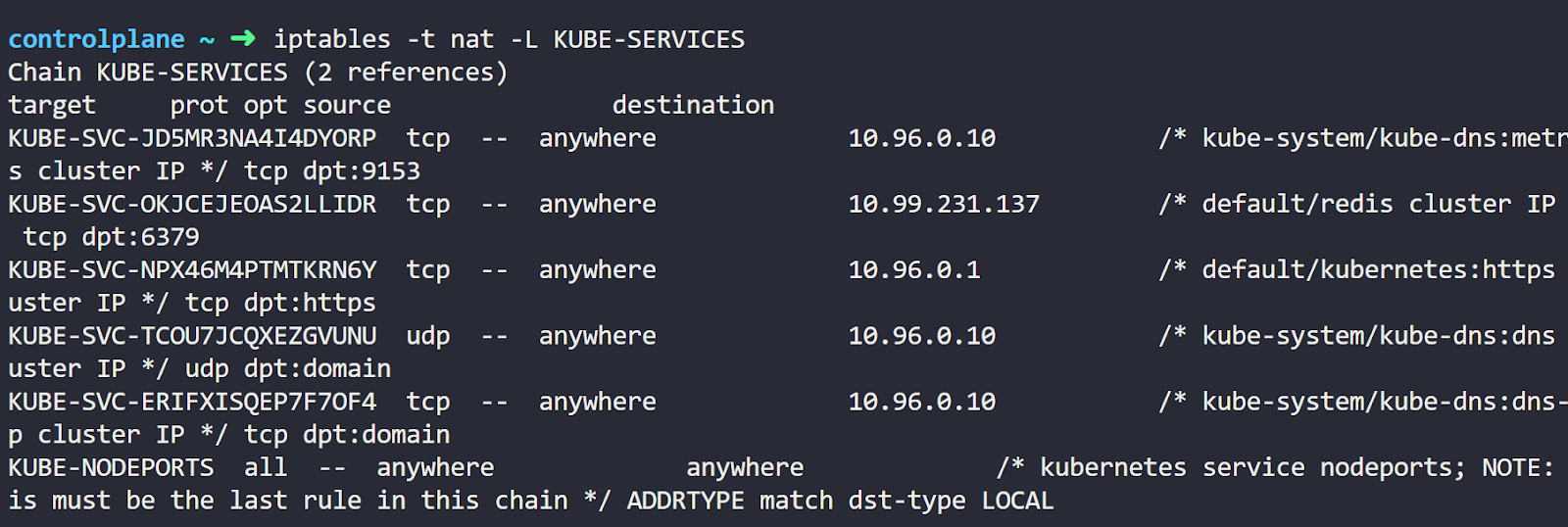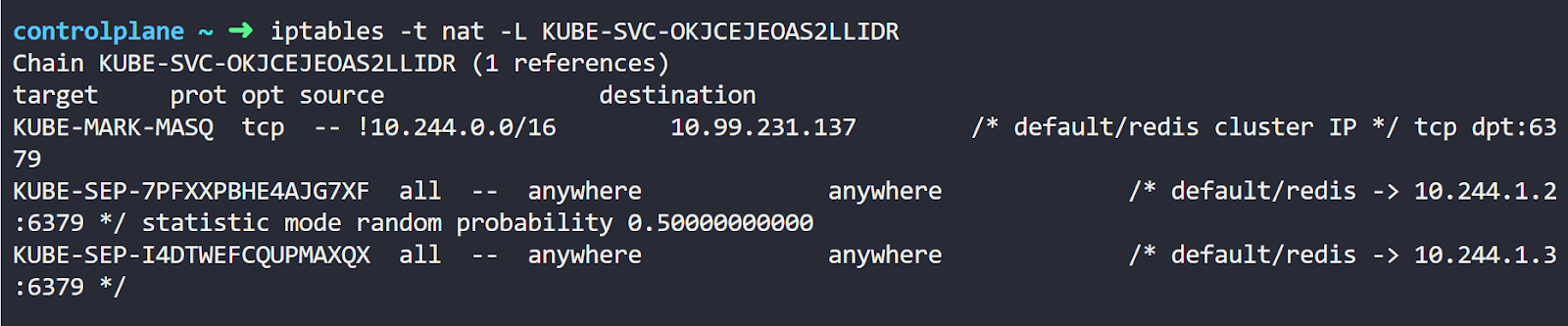 The IP addresses matter to us here. You’ll notice a specific chain created with a rule for the service's destination IP. This means that traffic destined for the service will enter that chain.