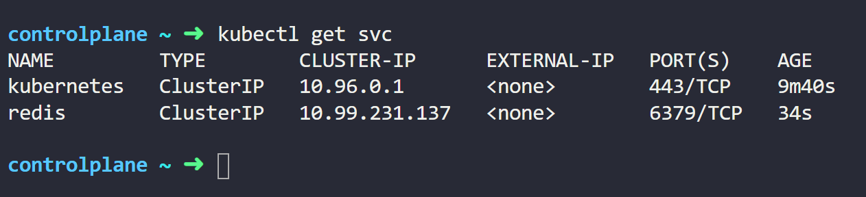 kubectl get svcFrom the output below, we can see our redis Service with its IP address.