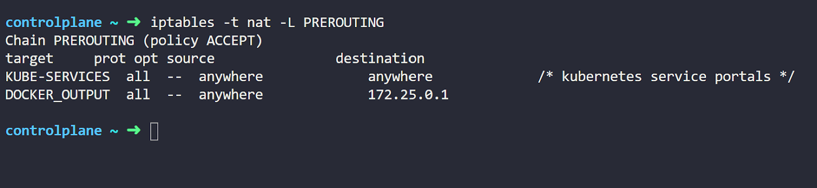 Here, we want to list the nat rules inside the PREROUTING chain. Now, let’s move to the command output. The most important part of the output here is the KUBE-SERVICES line. This is a custom chain created by Kube-Proxy for the Services.